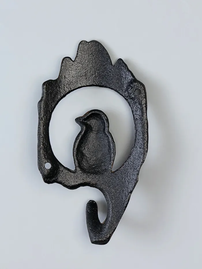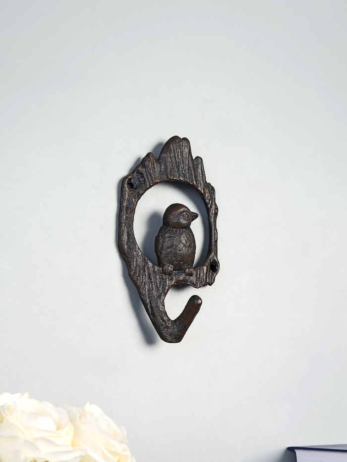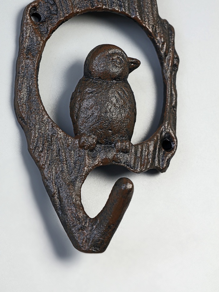Чугунный настенный крючок с изящным изображением птички в дупле привносит в интерьер атмосферу тепла и природной гармонии. Его фигурная форма и коричневый цвет подчёркивают прочность материала и художественную выразительность, делая изделие одновременно функциональным и декоративным элементом.