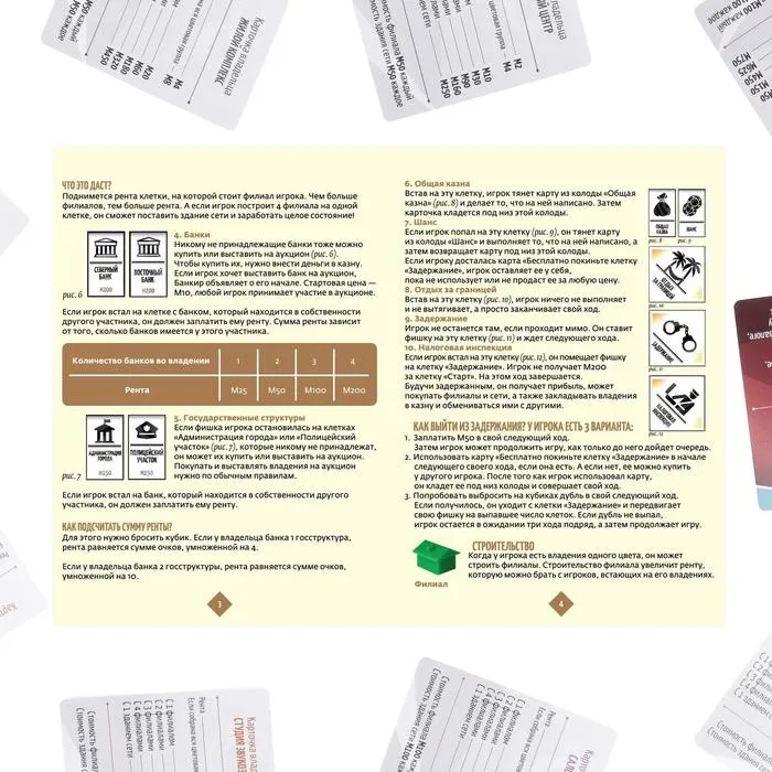 Помните: чтобы победить, вам нужно заработать больше, чем остальные участники. Для этого передвигайтесь по игровому полю, покупайте собственность, стройте филиалы и сети, периодически «отдыхайте за границей». Когда другие участники встанут на клетки с вашей собственностью, они будут платить ренту. А карточки «Шанс» и «Общая казна» добавят процессу динамики.