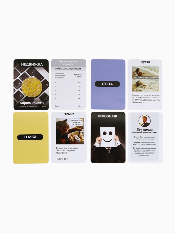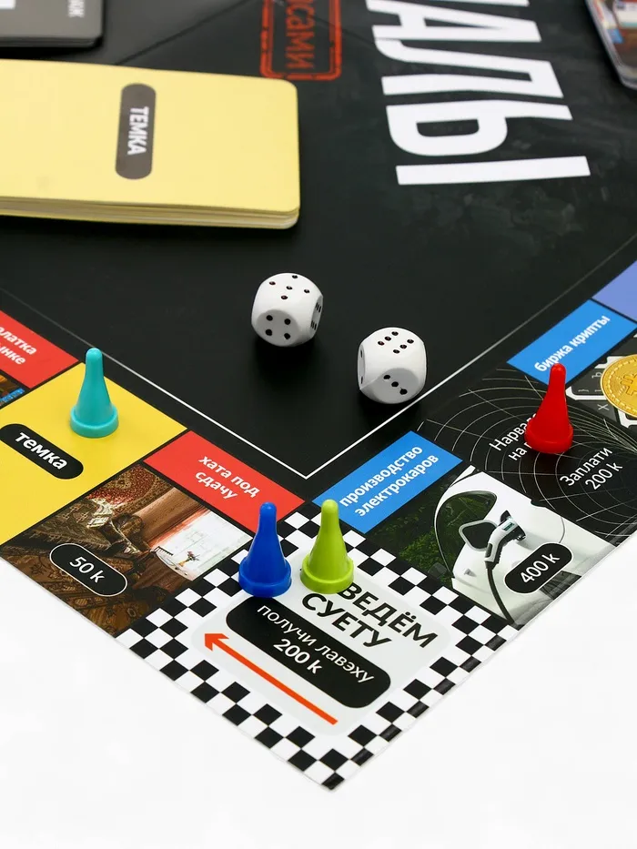 Мечтал открыть собственную шаурмичку или замутить криптобиржу? Настольная игра «Решалы» — это динамичная карточная экономика для компании от 2 до 6 игроков. Здесь каждый получает роль с уникальными возможностями, а победа зависит от хитрости, расчёта и умения рисковать. Основные правила те же: скупай недвижку, совершай сделки и наводи суету — останься единственным не обанкротившимся игроком.
