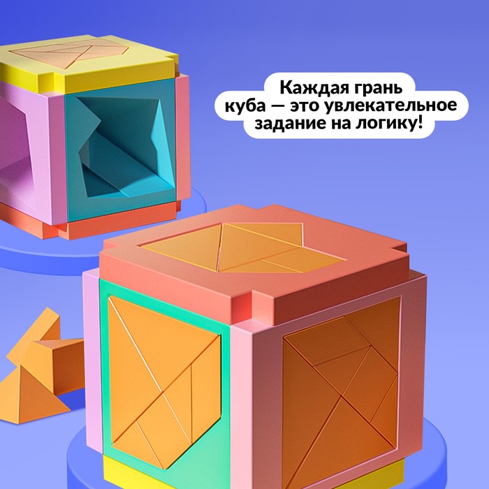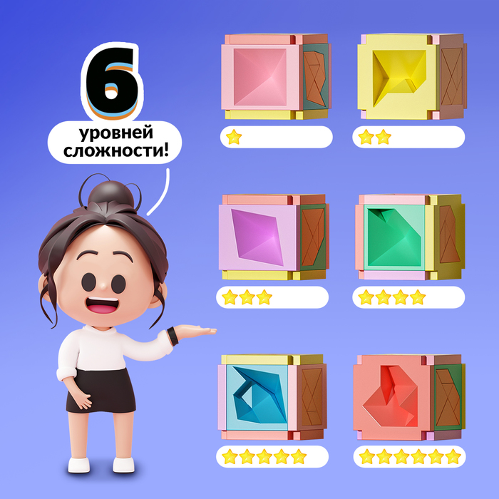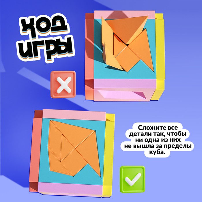 Ваша задача — решить 6 непростых, но увлекательных головоломок. Будьте внимательны: ни одна деталь не должна выйти за пределы куба.