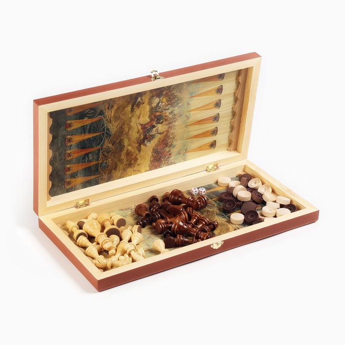 Шахматы, нарды, шашки 3 в 1 – это настольные игры, в которые могут играть как дети, так и взрослые, они могут быть использованы в качестве развивающей игрушки для детей, а для взрослых они могут стать увлекательным хобби. В набор входит: шахматная доска, шахматные фигуры покрытые лаком, у основания которых противоскользящая поверхность, фишки для игры в нарды, кости игральные 2 шт.