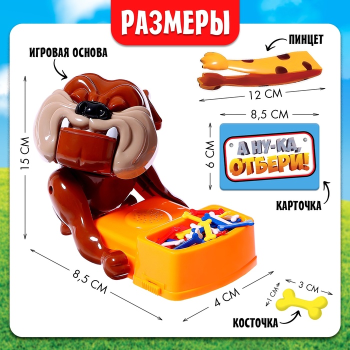 «А ну-ка, отбери!» — это весёлая настольная игра на везение. Она подойдёт для всей семьи, потому что понравится и детям, и взрослым. Цель игры — собрать как можно больше вкусняшек, не разбудив при этом спящего пса. В любой момент собака может проснуться и залаять!