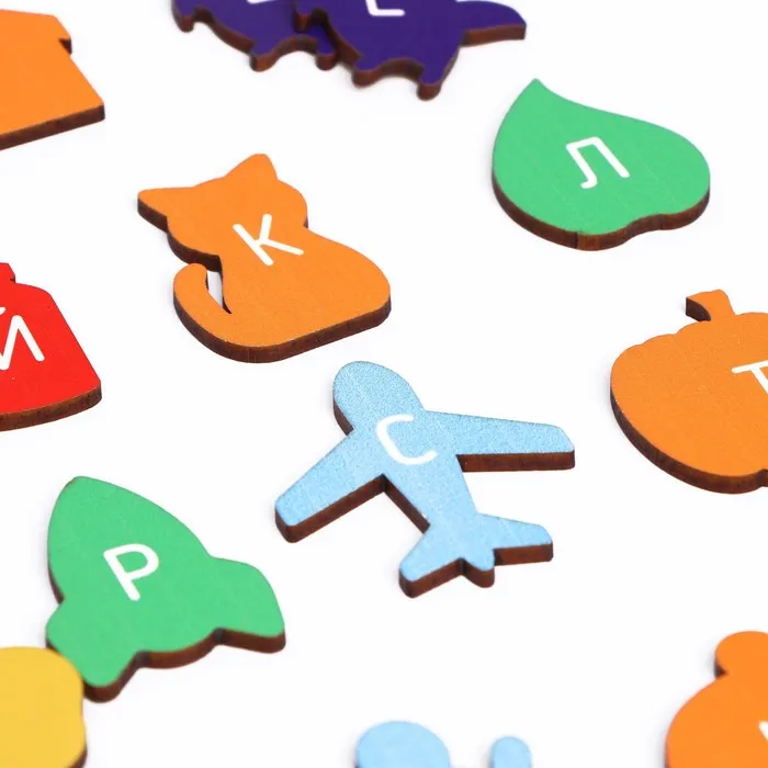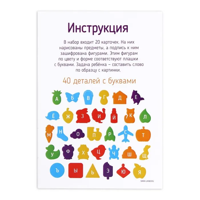 - В набор входит 20 карточек. На них нарисованы разные предметы, а подпись к ним зашифрована фигурками. Этим фигурам по цвету и форме соответствуют деревянные плашки с буквами.