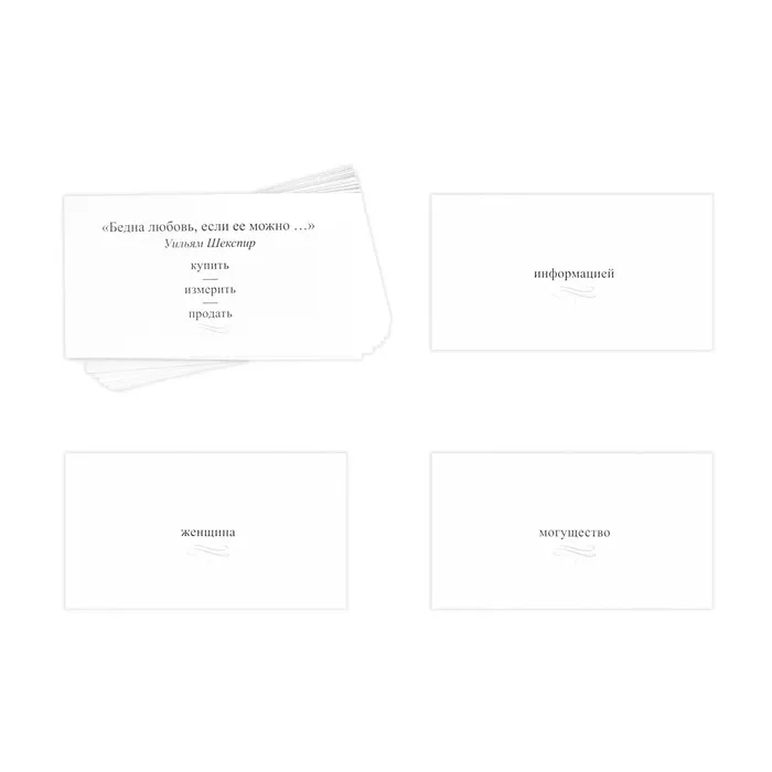 На лицевой стороне карточки написана цитата известного человека, в которой выпущено одно слово. На этой же стороне карты три варианта ответа. Правильный вариант только один. Задача игрока – определить его. Чтобы проверить себя или другого участника, просто переверните карту. Там находится ответ.