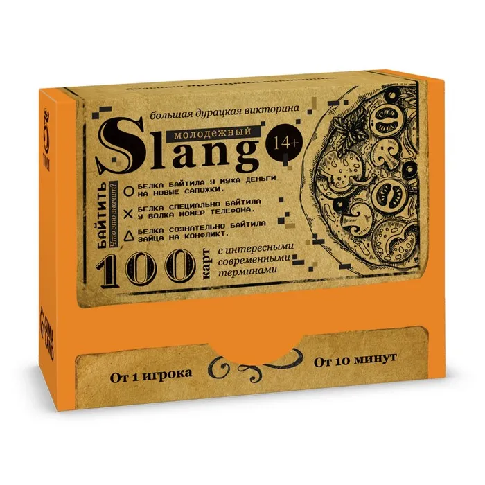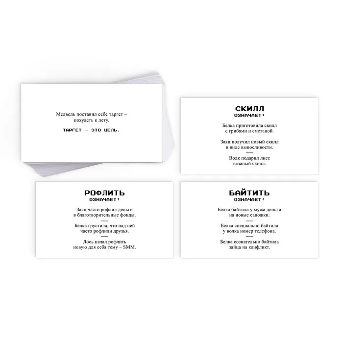Встречайте продолжение легендарной викторины! На карточке написано странное слово из молодежного сленга и три примера его использования. Задача игрока – выбрать правильный пример. Чтобы проверить себя или другого участника, просто переверните карту. Там находится ответ и определение слова.
