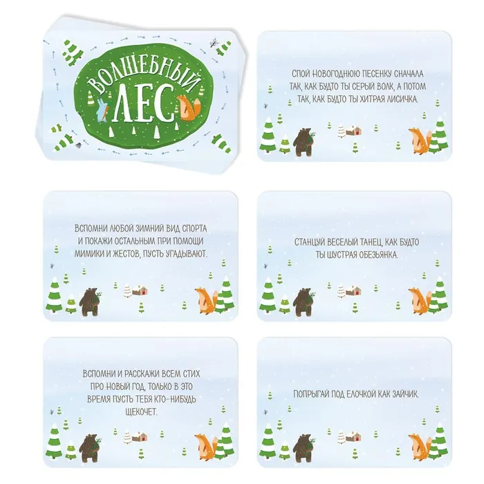 Лисичка, олень, медвежонок, зайчик и мышка спешат встретить Новый год, но совсем заплутали в лесу. Помогите им добраться до Деда Мороза и получить подарки! Передвигайте фишки по игровому полю и внимательно смотрите на специальные обозначения. Вас ждут приключения и весёлые задания на карточках!