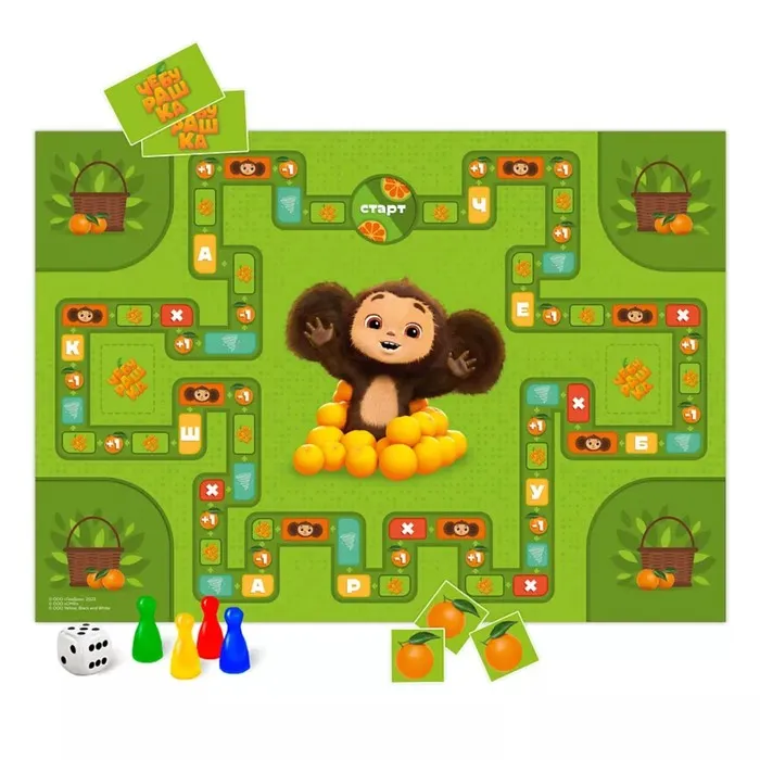 Настольная игра «Чебурашка» — увлекательное развлечение для детей. Ребёнка ждут захватывающее апельсиновое приключение с любимым героем мультфильма. Яркие цвета и интересные задания увлекут непоседу надолго и помогут весело и с пользой провести время.