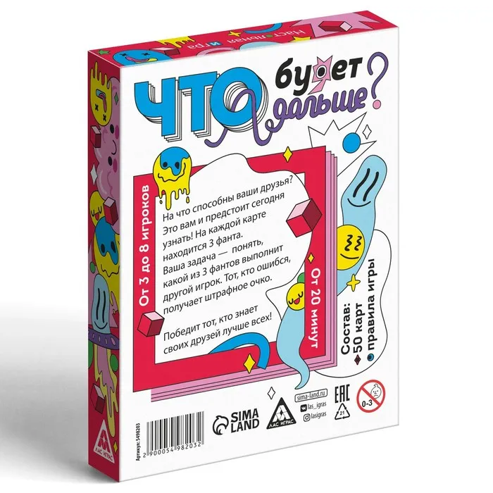 На что способы ваши друзья? Это вам и предстоит сегодня узнать! На каждой карте написаны 3 фанта. Ваша задача: понять, какой из них выполнит другой игрок. Тот, кто ошибся, получает штрафное очко. Победит тот, кто знает своих друзей лучше!