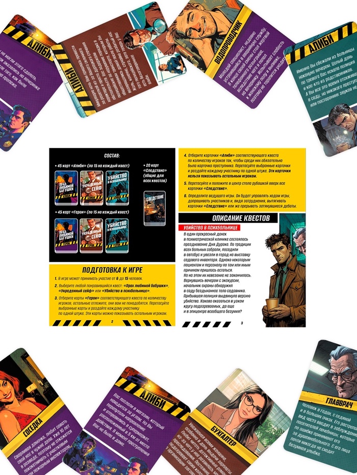 - 110 карточек (45 карт «Герои», 45 карт «Алиби», 20 карт «Дело»)