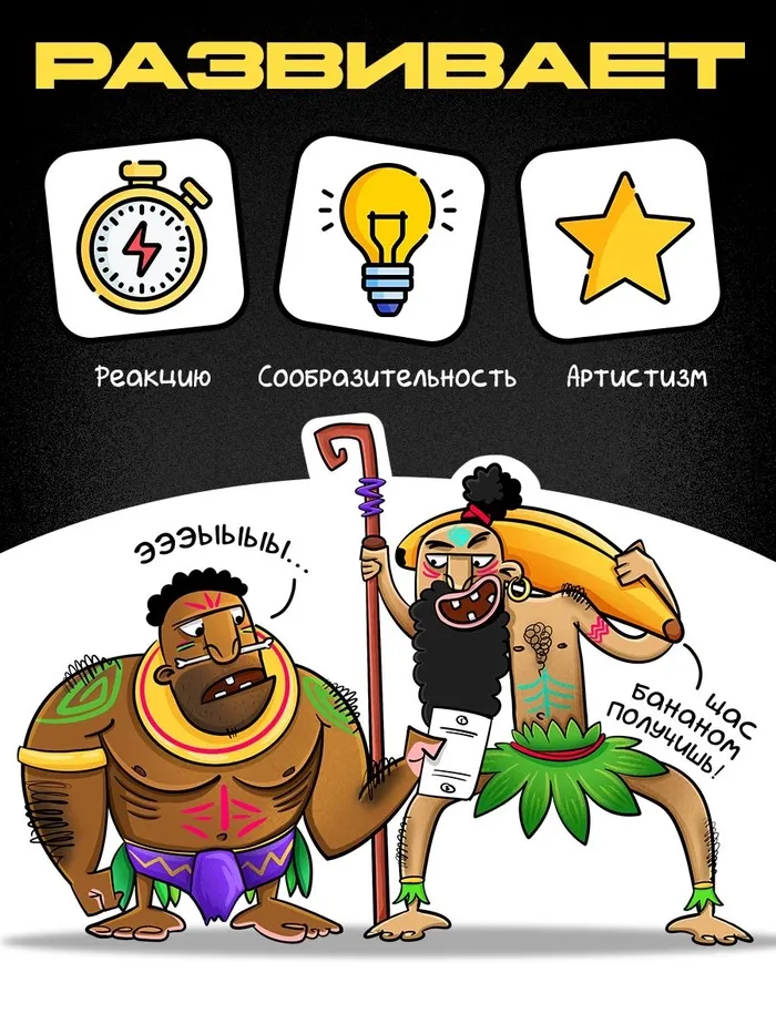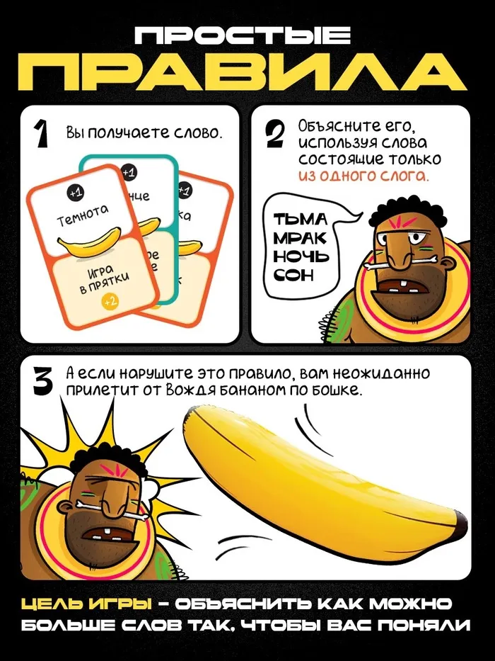 Вы получаете карточку со словом. Объясните его, используя слова, состоящие только из одного слога. Если нарушите правила, вам нежно прилетит от Вождя бананом по голове.