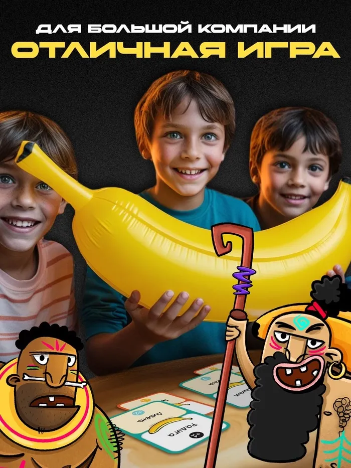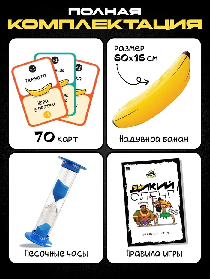 - В комплекте вы найдёте всё для игры: карточки со словами, песочные часы для ограничения времени и яркий надувной банан размером 60 × 16 см.