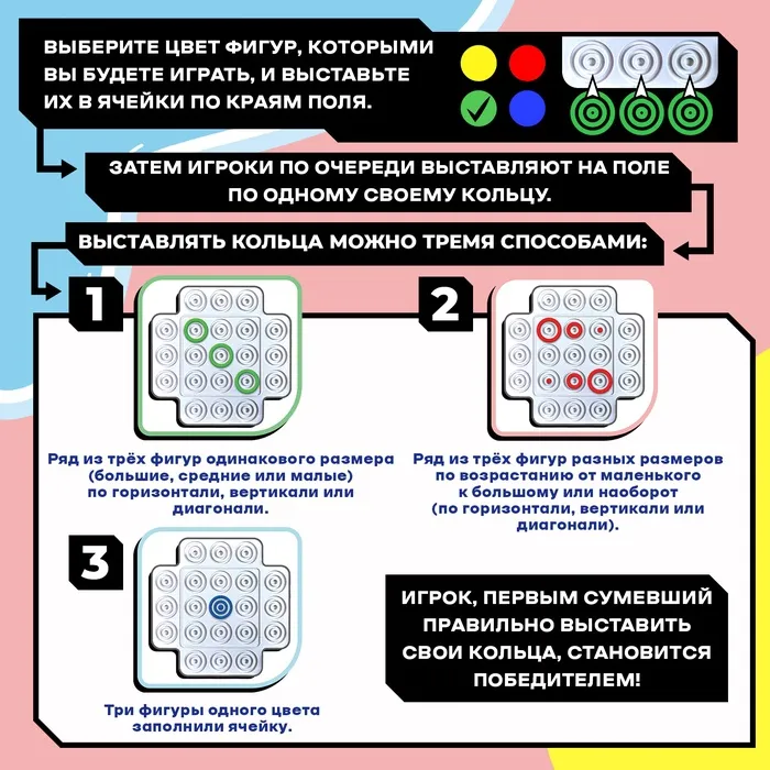 «Логикруг» — настольная игра для детей от 5 лет. Захватывающая настолка с яркими элементами предназначена для веселой тренировки на логику и увлекательного времяпровождения. Задача ребёнка — составить три фигуры своего цвета по горизонтали, вертикали или диагонали или заполнить одну ячейку только своими кольцами.