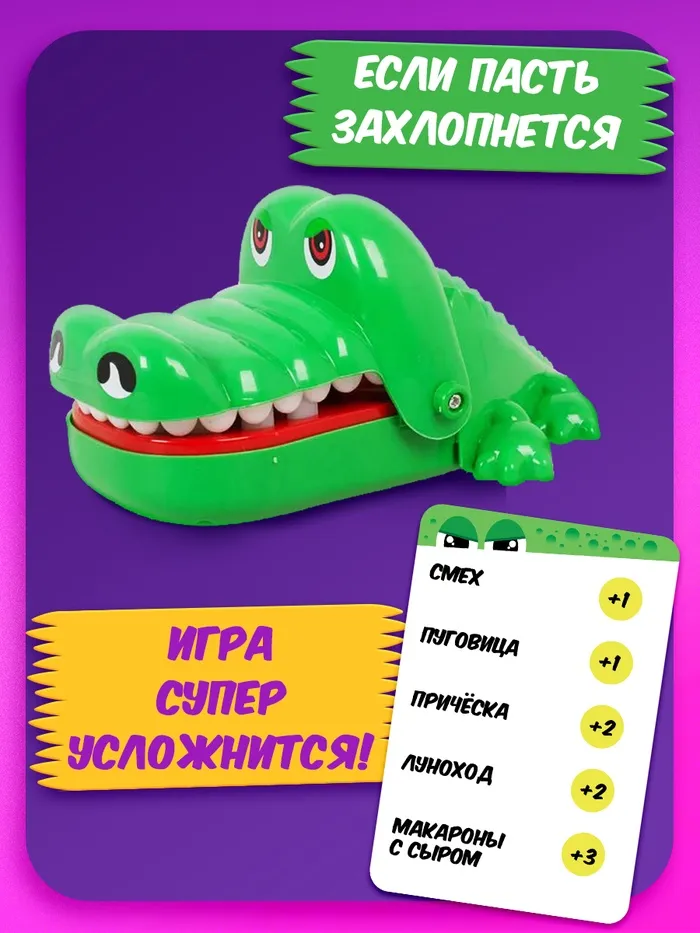 Нажимайте на один из зубов крокодила, чтобы проверить свою удачу. Если нажимаете на «неправильный» зуб — пасть закрывается и вы переходите в следующую игру «Супер-сет». За ограниченное количество времени вы рассказываете участникам 5 слов с карточки. Есть возможность получить сразу 10 баллов. Но если игроки не угадали слова, то все баллы сгорают.