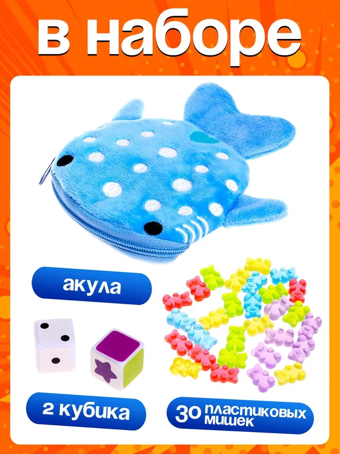 - Цвет кубика обозначает цвет мишек, которыми нужно покормить акулу, а число точек на гранях — их количество. Если на кубике с цветами выпала звёздочка, можно покормить акулу мишками любых цветов.