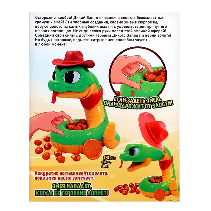 Аккуратно вытаскивайте из сложенного в кольцо хвоста золото, пока змея вас не замечает.Если змея не напала на вас — можете забрать слиток или золотую монету.Если коснуться змеи, она загремит хвостом и завибрирует.Игра заканчивается в тот момент, когда все сокровища разберут. Победит тот, кто заработает больше всех баллов.Такой подарок поможет ребёнку развить реакцию. Он зарядится энергией и научится концентрировать внимание.