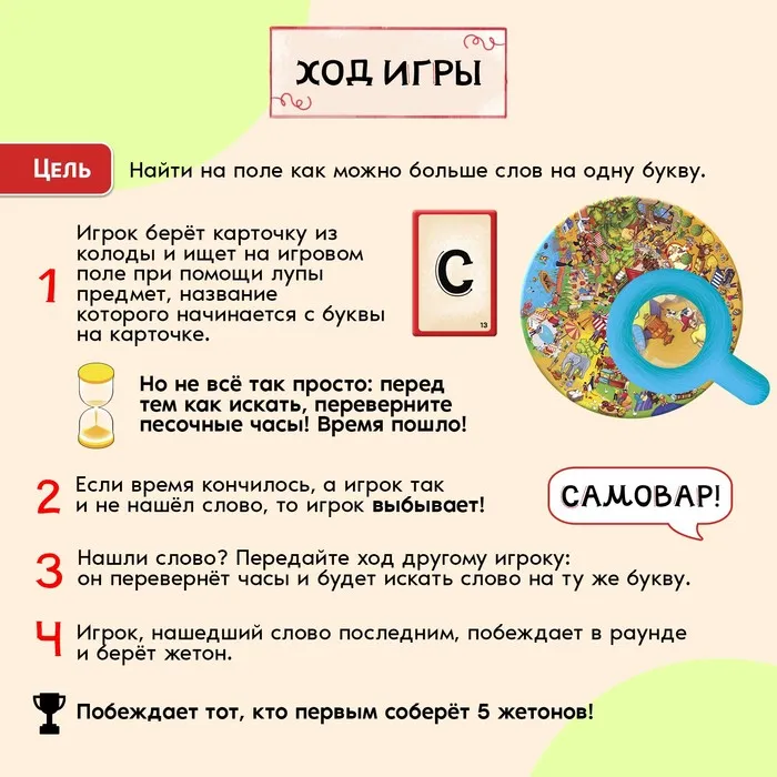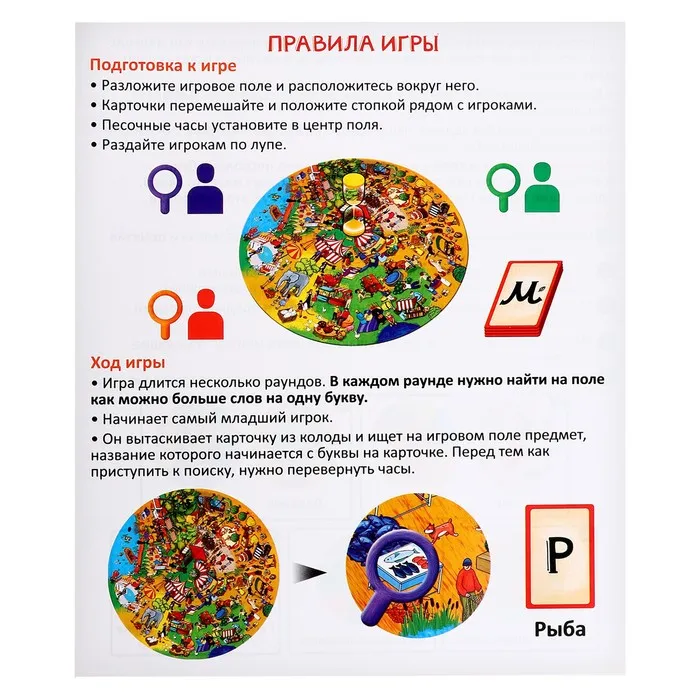 - Первый игрок вытаскивает карточку из колоды и ищет на игровом поле предмет, название которого начинается с буквы на карточке. Участник переворачивает часы и начинает поиск.