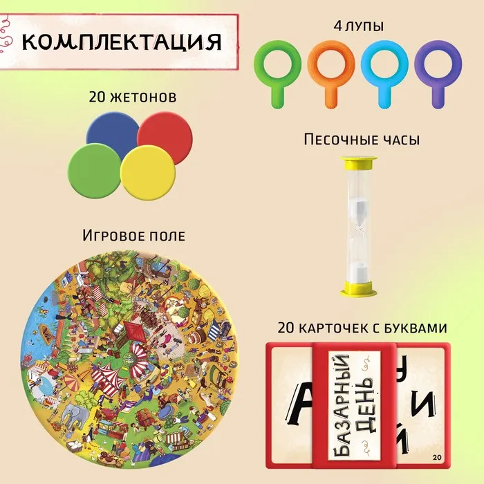 С настольной игрой «Базарный день» ребёнок прокачает логическое мышление, внимательность и расширит словарный запас. Ведь чтобы обыграть соперников, нужно не просто искать предметы, но и справляться с этим за ограниченное время!