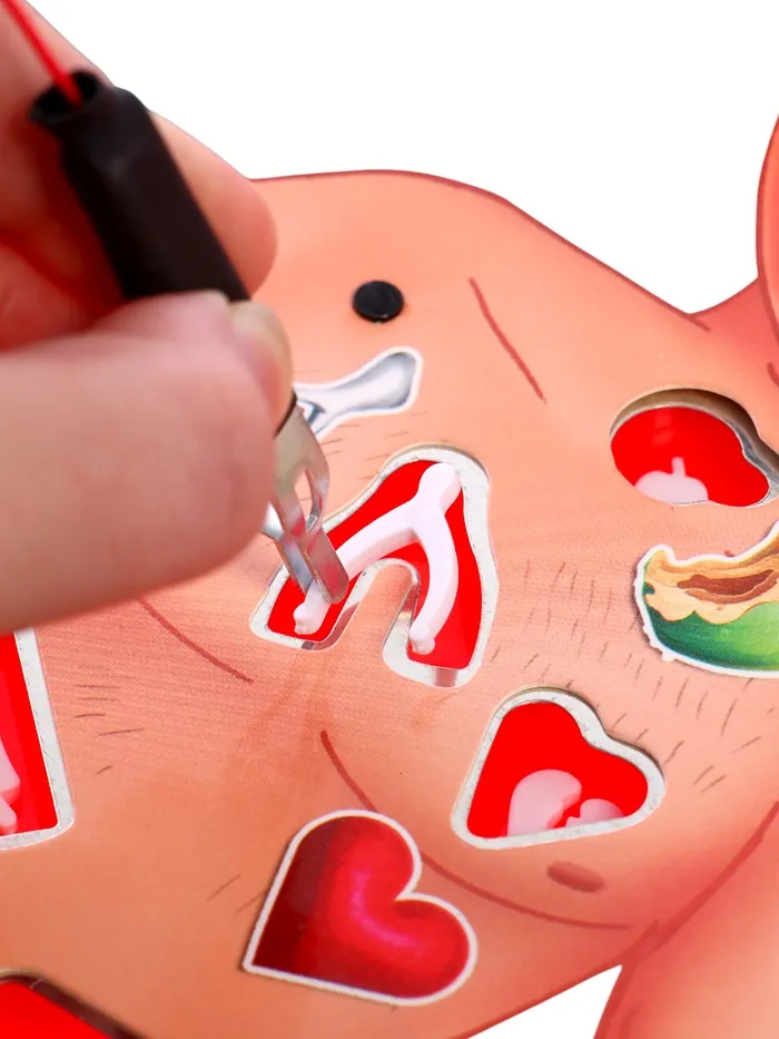 - Разложите все пластиковые предметы по соответствующим отверстиям в пациенте.