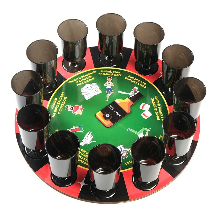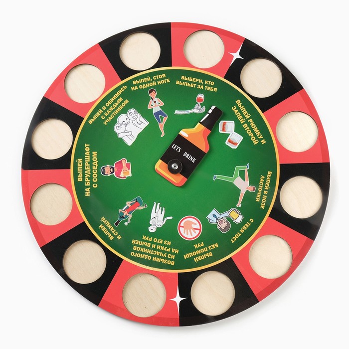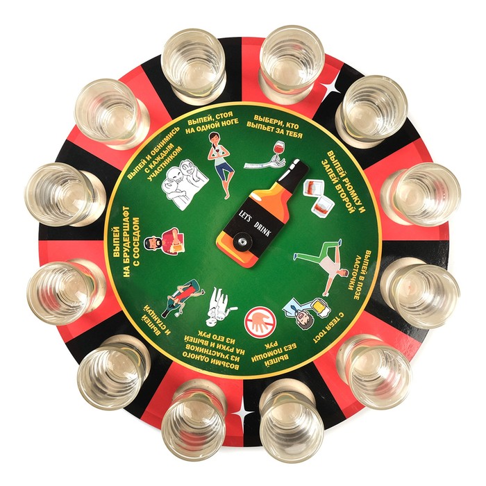 Налейте в стопки алкоголь, раскрутите барабан. После остановки стрелочки в одной из ячеек, человек должен выполнить выпавшее задание. Для разнообразия можно придумывать свои правила игры, например, давайть штрафные задания, если выпавшее задание выполнено недостаточно хорошо, по мнению участников игры.