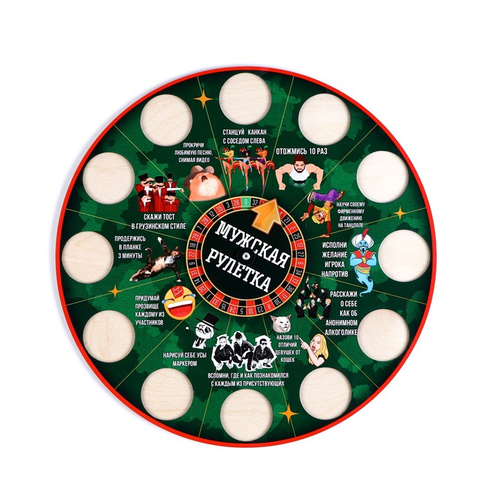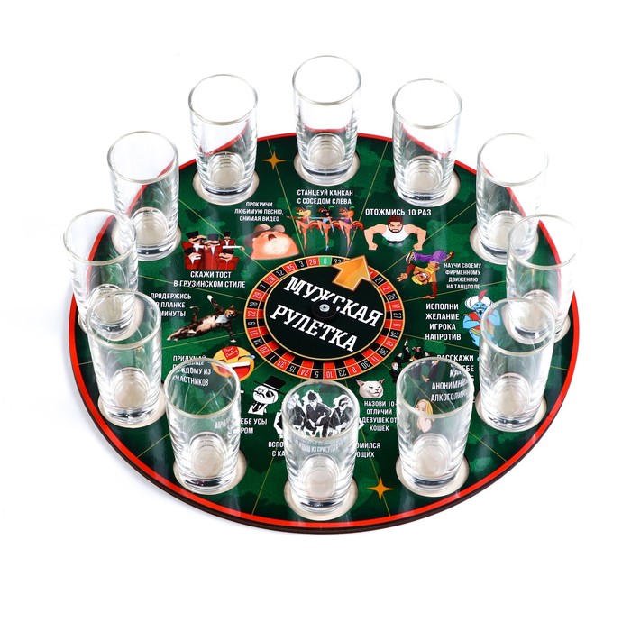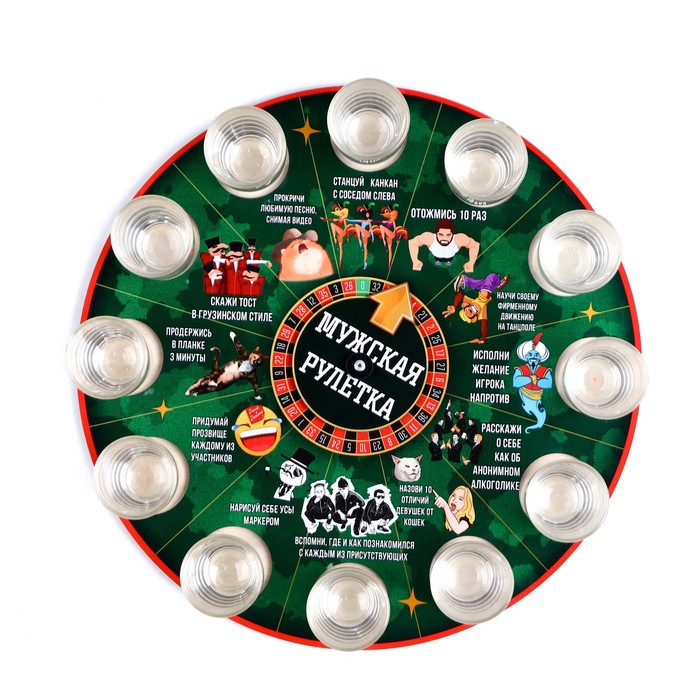 Налейте в стопки алкоголь, раскрутите барабан. После остановки стрелочки в одной из ячеек, человек должен выполнить выпавшее задание. Для разнообразия можно придумывать свои правила игры, например, давайть штрафные задания, если выпавшее задание выполнено недостаточно хорошо, по мнению участников игры.
