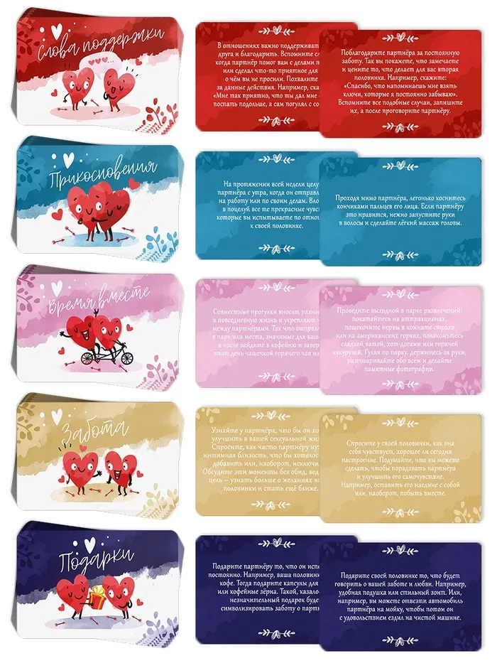 - 50 карт («Слова поддержки», «Время вместе», «Подарки», «Забота», «Прикосновения»)