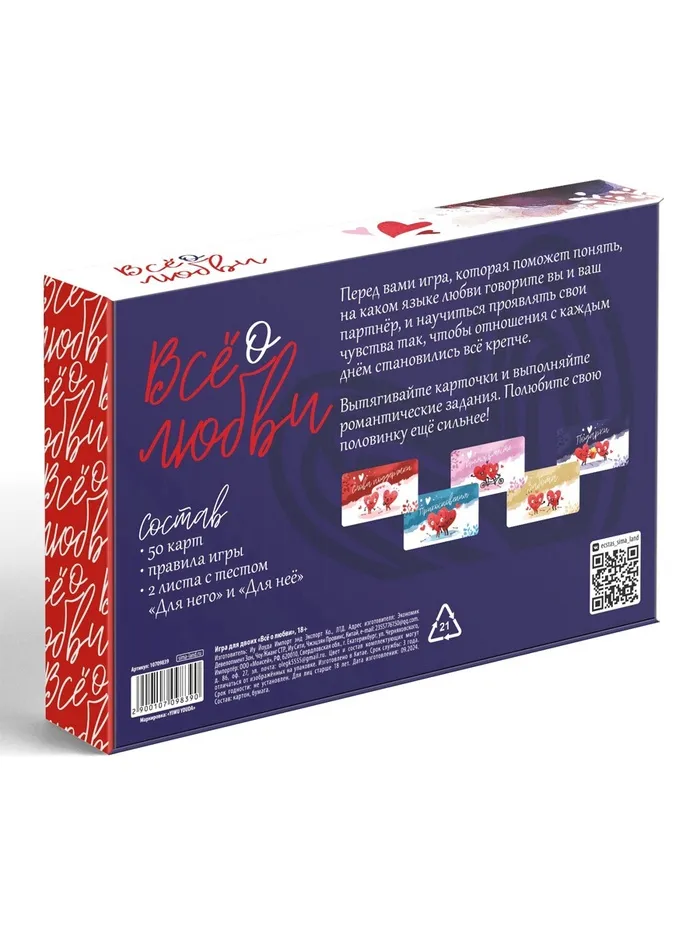 «Всё о любви» – это игра, которая поможет понять, на каком языке любви говорите вы и ваш партнёр. Также вы научитесь проявлять чувства так, чтобы отношения с каждым днём становились всё крепче.
