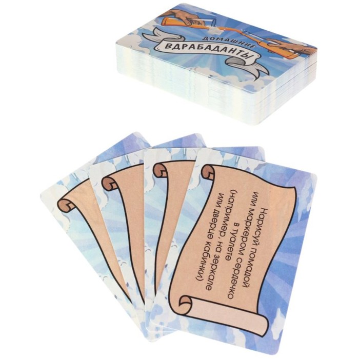 ХОД ИГРЫ: Игроки по очереди берут карточки сверху колоды. Игрок, взявший карточку, читает текст вслух. После этого игрок должен выполнить задание на карточке. Если игрок выполняет задание, он оставляет карточку себе. Если игрок не справляется с заданием или отказывается выполнять его, он откладывает карточку в сторону и выпивает штрафную. На некоторых карточках с заданиями есть особые условия того, как необходимо пить штрафную и в каком количество. Стандартная штрафная: полная рюмка или бокал того напитка, который участник пил до этого. Ход переходит к следующему участнику в очереди. Игра завершается, когда все карточки в колоде закончились (либо вы можете заранее договориться о том, сколько кругов будет проходить игра). Выигрывает игрок, перед которым лежит наибольшее количество карточек с выполненными заданиями. Желаем веселой игры!