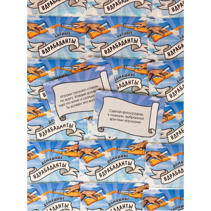 ПОДГОТОВКА К ИГРЕ: Перемешайте колоду и положите ее рубашкой вверх. (В игре есть два типа карточек: "Домашние вдрабаданты" и "Барные вдрабаданты". Задание в первых больше подходят для домашних посиделок, хотя их можно использовать и в барах, а вот условия вторых напрямую связаны с барами и использовать их имеет смысл как раз в таких заведениях). Наполните свои рюмки или бокалы алкогольными напитками. Выберите игрока, который будет ходить первым.