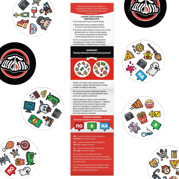 Внимание! На некоторых карточках есть один или несколько специальных символов. Как только вы их заметили, хлопайте по карте и кричите слова. Должны предупредить, что слова нецензурные, поэтому будьте внимательны. Тот, кто первым выкрикнул слово и хлопнул по карте, забирает её себе.