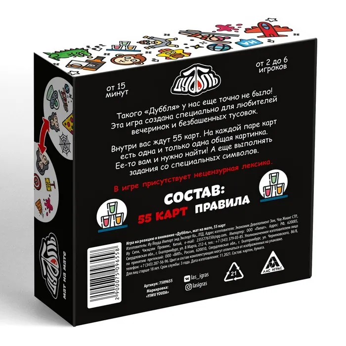 Эта игра создана специально для любителей вечеринок и безбашенных тусовок. Внутри вас ждут 55 уникальных карт. На каждой паре карт есть только одна общая картинка. Её-то вам и нужно найти. А ещё выполнять задания со специальных символов. Внимание! В игре присутствует нецензурная лексика.