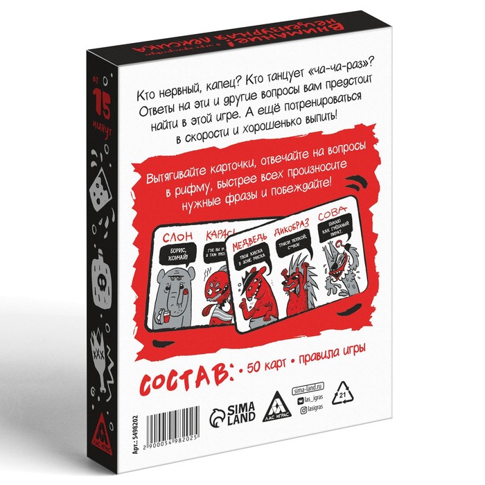 Кто нервный, капец? Кто танцует «ча-ча-раз»? Ответы на эти и другие вопросы вам предстоит найти в этой игре. А ещё потренироваться в скорости и хорошенько выпить! Вытягивайте карточки, отвечайте на вопросы в рифму, быстрее всех произносите нужные фразы и побеждайте!