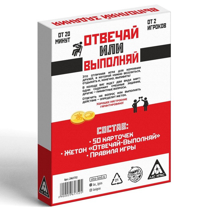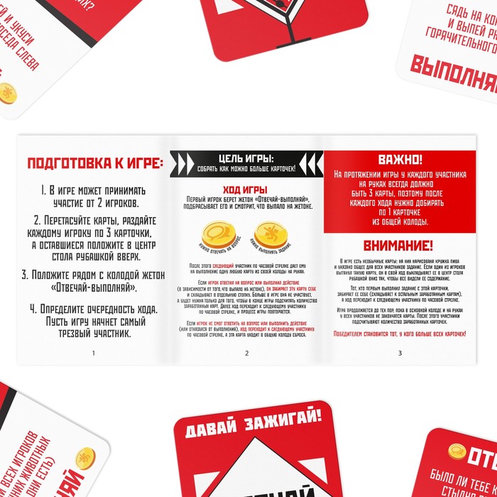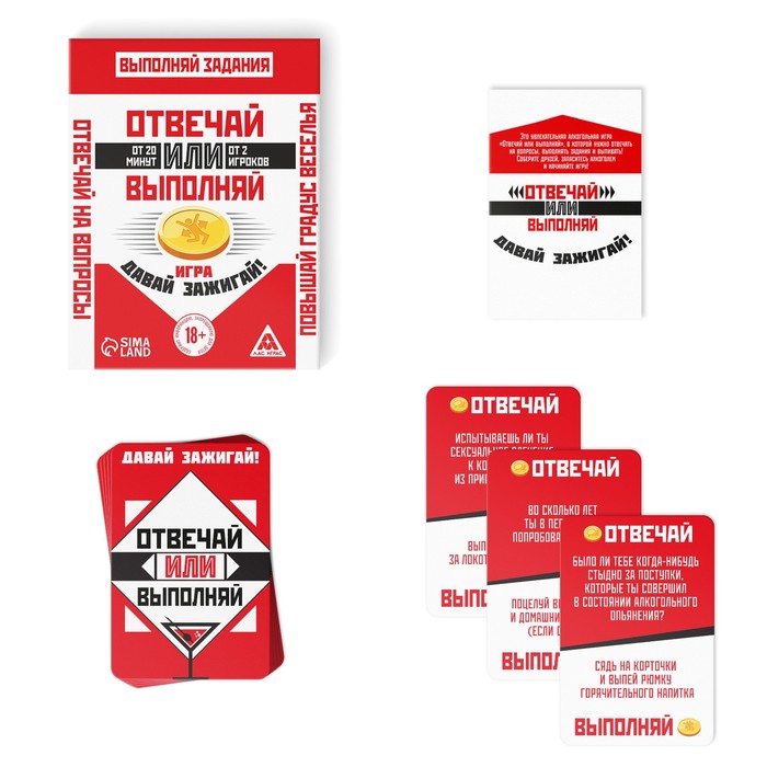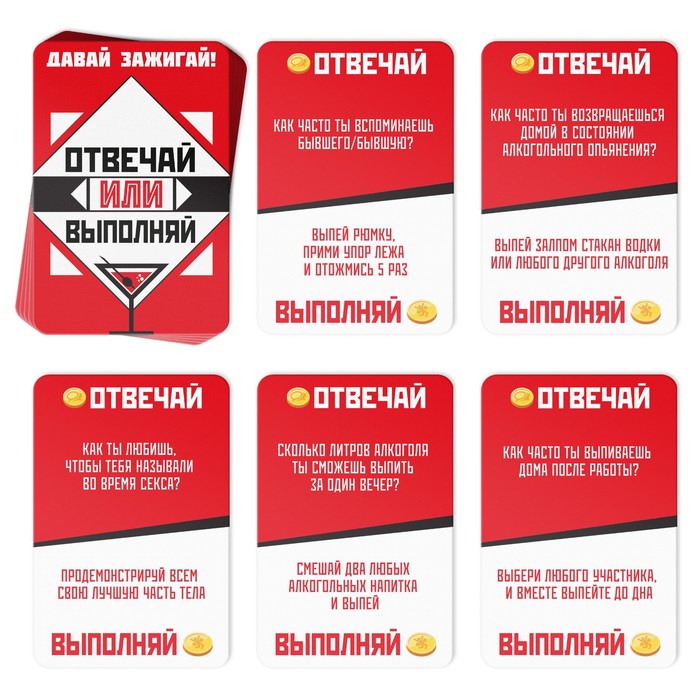 В колоде есть 2 вида карт: одни содержат смешные задания, другие — пикантные вопросы. Отвечать честно или импровизировать, выбирать вам. Главное, чтобы было очень весело!