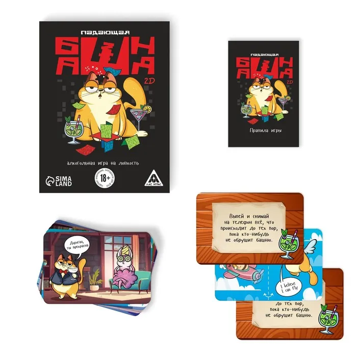 Можно ли быть немного под градусом, но при этом ловким и грациозным? Сейчас проверим! Здесь вам предстоит строить башню из карточек, при этом играть можно как командой, так и каждый сам за себя. В правилах мы подготовили целых 3 варианта игры. Они все разные, но есть кое-что общее – не обрушить башню! Иначе придётся опрокидывать рюмочки и выполнять умопомрачительные задания.