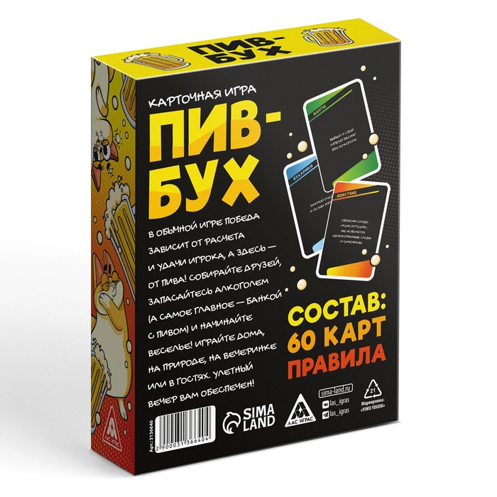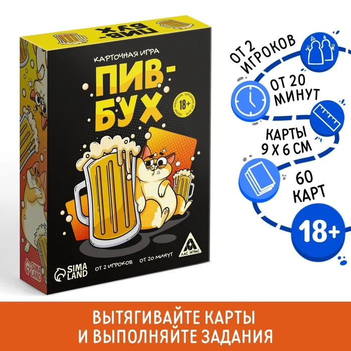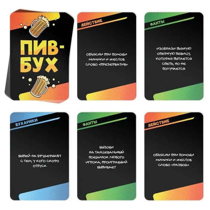 Нужно по очереди вытягивать карточки и выполнять задания, которые на них написаны. Но это ещё не всё — использованные карточки участники не сбрасывают, а вставляют под кольцо пивной банки. Тот, от чьей карты банка откроется, проигрывает!