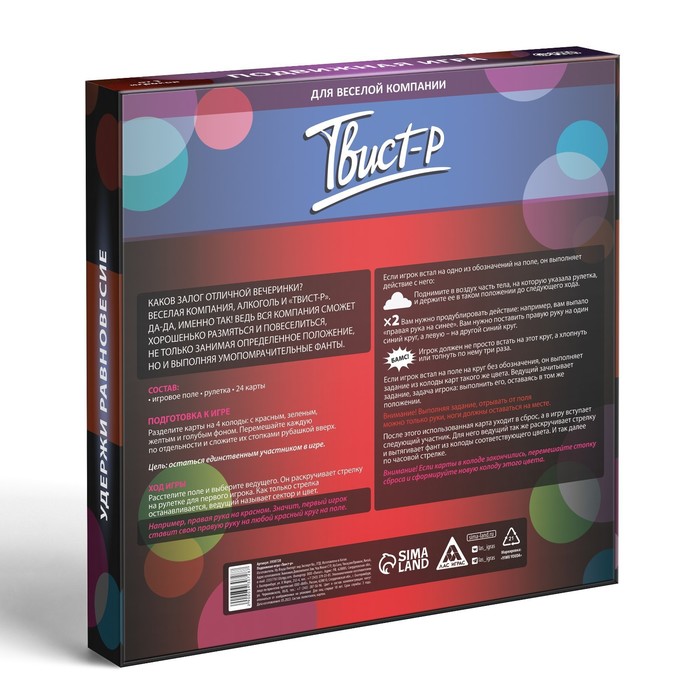 Каков залог отличной вечеринки? Весёлая компания, алкоголь и «Твист-р». Да-да, именно так! Ведь вам предстоит хорошенько поразмяться и посмеяться, занимая неудобные положения на игровом поле и выполняя умопомрачительные фанты. Готовы как следует зажечь? Тогда скорее начинайте игру!