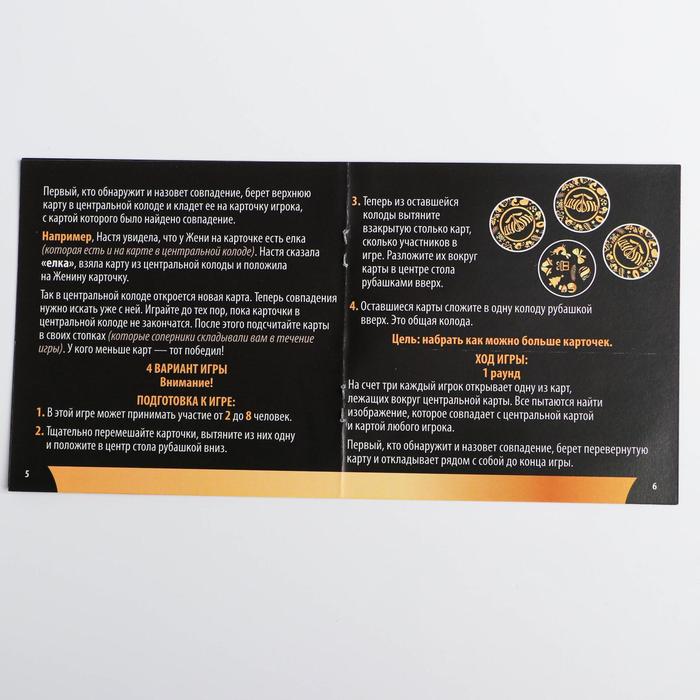 Первый, кто отыщет такую картинку, кричит её название, забирает верхнюю карту из колоды и кладёт сверху на свою. Тем самым он открывает следующую карточку из основной колоды, и теперь совпадения нужно искать уже с другими картинками.