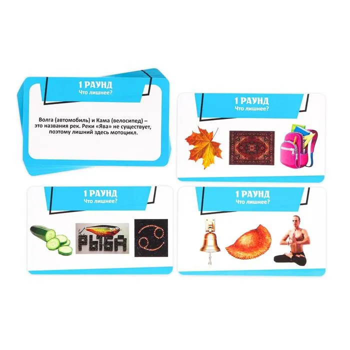 - Что лишнее? На одной стороне карты находится вопрос и картинки, а на другой — ответ. Игрок показывает карту своему сопернику. Задача соперника: за 30 секунд понять, какая из картинок лишняя.