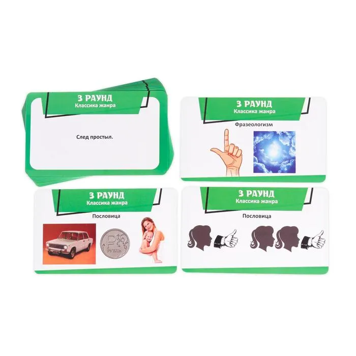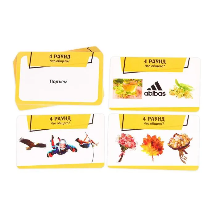 - Что общего? Здесь необходимо посмотреть на картинки и понять, что на них общего. На это даётся 1 минута. Подсчитайте количество карточек, полученных за этот раунд. Тот, у кого их больше, считается победителем раунда и получает 1 балл.
