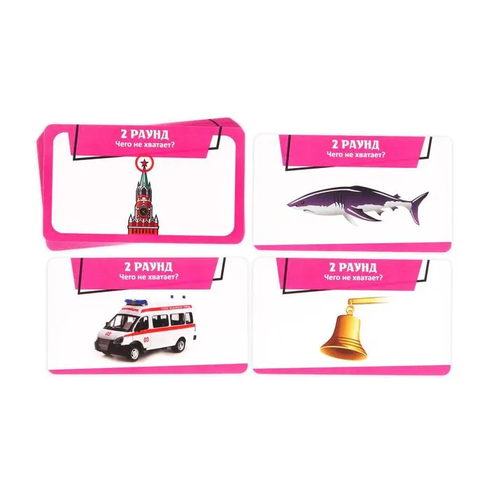 Подсчитайте количество карточек, полученных за этот раунд. У кого их больше, тот считается победителем и получает 1 балл. - Чего не хватает? На одной стороне карты находится вопрос и картинка, в которой упущена какая-то деталь. На другой стороне находится цельная картинка. Здесь необходимо внимательно посмотреть на картинку и за 30 секунд сказать, чего на ней не хватает. Подсчитайте количество карточек, полученных за этот раунд. Тот, у кого их больше, считается победителем и получает 1 балл.