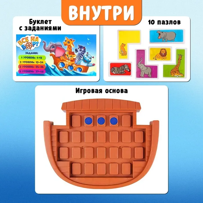 Настольная игра-головоломка «Все на борт» — для настоящих героев! Она представляет собой набор пластиковых карт с животными. Зверята отправились в путешествие, но вот беда — они не знают, как разместиться на одном корабле. С помощью логики и смекалки помогите им отправиться в путешествие.
