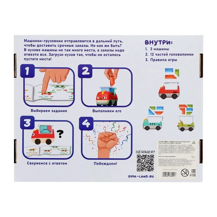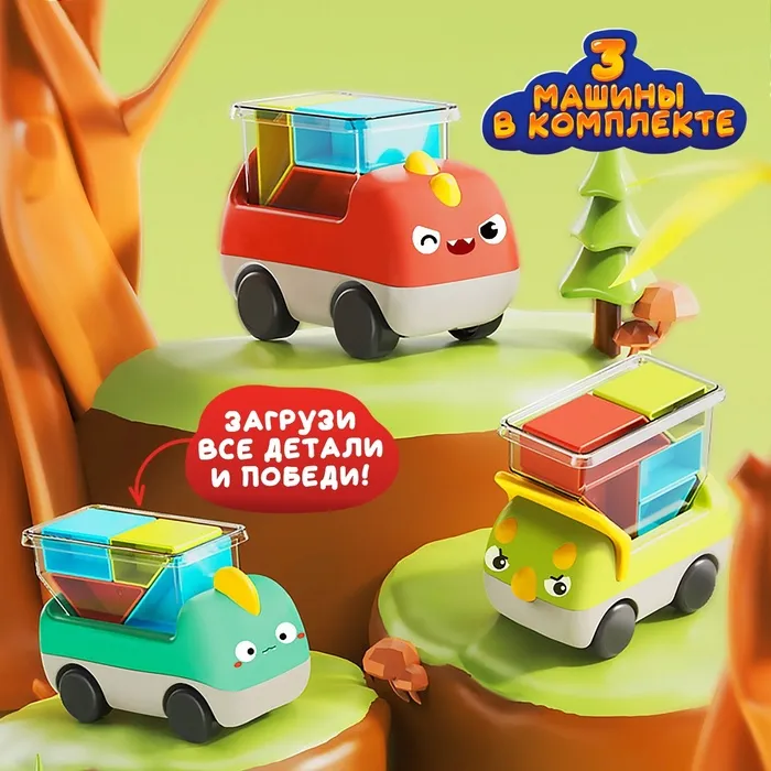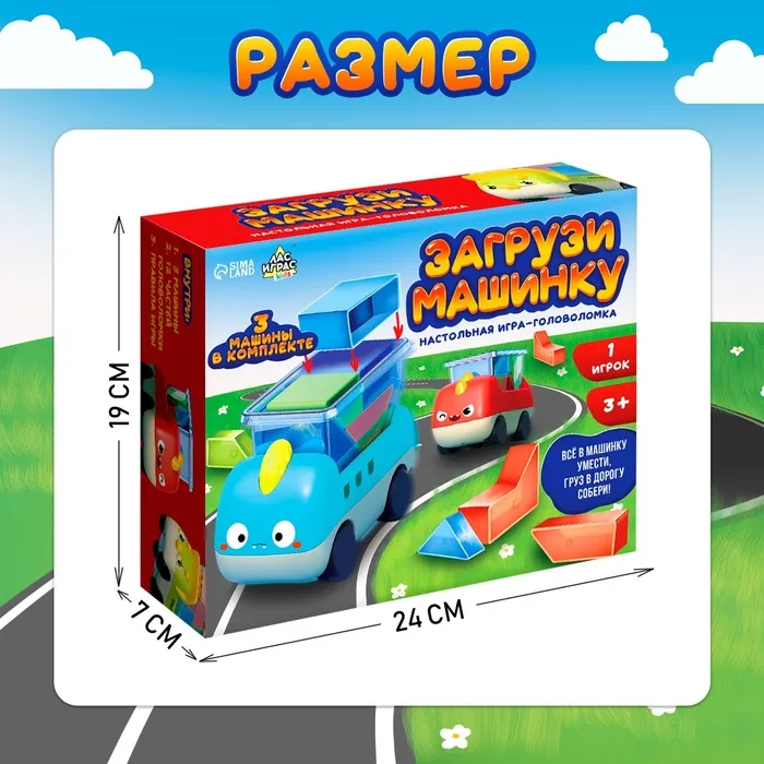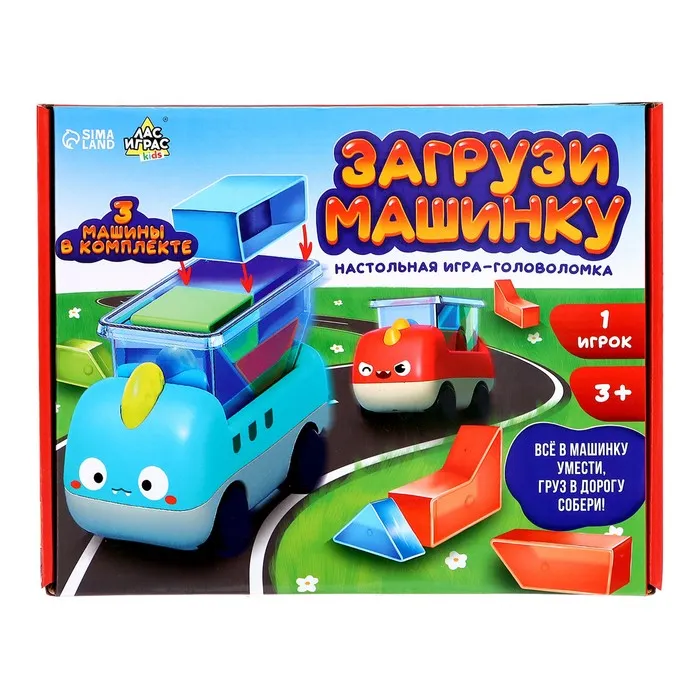 Выберите задание и разместите детали по машинкам так, чтобы они не выглядывали за края кузова.