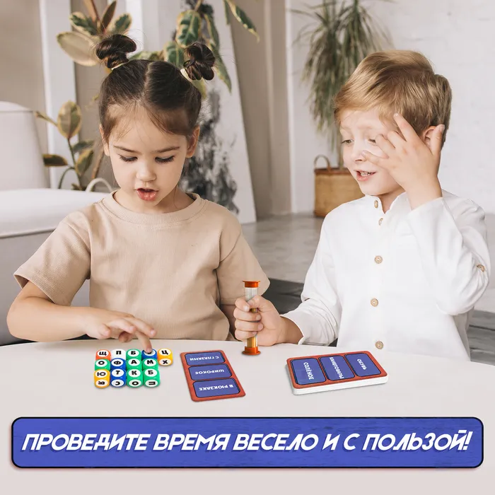 - Песочные часы и все кубики положите между игроками. В игре есть 2 типа кубиков: цветные показывают, какие буквы нужно использовать, белый отвечает за место буквы в слове.