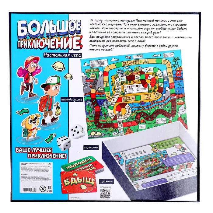 «Большое приключение» — настольная игра для детей от 6 лет. С весёлой бродилкой малыш окунётся в увлекательное путешествие. Волшебный мир снова в опасности! Ужасный монстр с армией грозных пельменей напал на жителей сказочного города. Отважные друзья спешат сразиться с врагом и остановить его злодеяния. Ребятам понадобится помощь маленьких и храбрых игроков. Вперёд навстречу захватывающим приключениям!