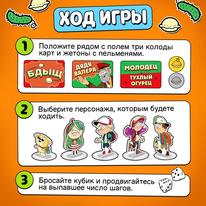 Перемешайте карточки и положите их рядом с игровым полем.Выберите себе фигурку персонажа и поставьте её на клетку «Старт».Игру начинает самый младший игрок.Как играть
