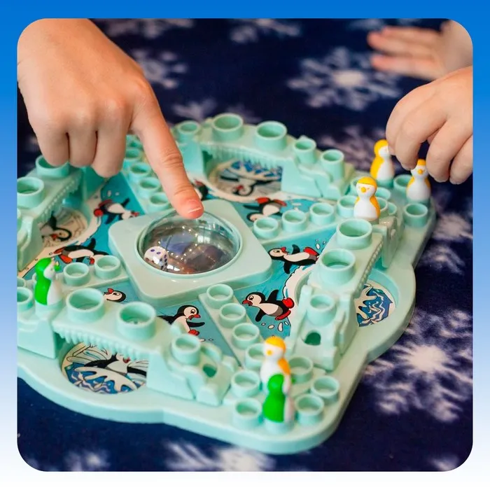 Соберите игровое поле по инструкции, выберите себе семью пингвинов и поставьте их в угол на 4 ячейки. Далее игроки ходят по очереди: кидают кубик и передвигают одного пингвина за ход на столько ячеек по часовой стрелке, сколько выпало на кубике. Потом ход переходит к следующему игроку.