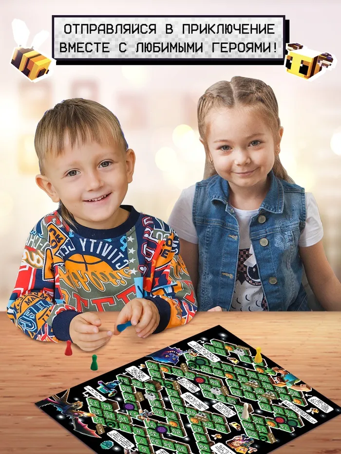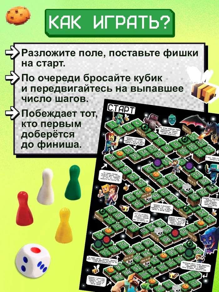 Отправляйся в приключение по пиксельному миру! Настольная игра «Пиксель-крафт» — это увлекательная бродилка для 2-4 игроков от 3 лет. Игроки исследуют красочное поле, собирают ресурсы и соревнуются, кто первым достигнет финиша. Простые правила и яркий дизайн делают игру идеальной для первого знакомства с настольными играми.