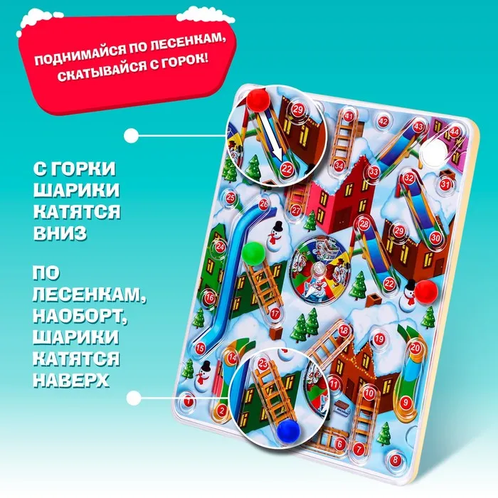 Возьмите вместо фишки шар и поставьте его на цифру 1, далее по очереди крутите стрелку: выпадет зелёный сектор – ходите на 1 ячейку вперёд, если синий – на 3, если жёлтый – на 4, если красный – на 6. Но по пути вас буду ждать испытания: попадёте на скат крыши – придётся скатиться вниз, если на лесенку – залезть по ней вверх. Выиграет самый быстрый и удачливый Дед Мороз!