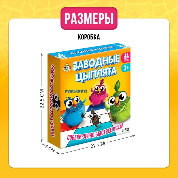 «Заводные цыплята» — это весёлая и увлекательная настольная игра-бродилка для детей от 3 лет. В игре участвуют от 2 до 4 игроков, которые играют за задорных цыплят. Цель игры — первым собрать 10 зёрнышек и первым вернуться домой.