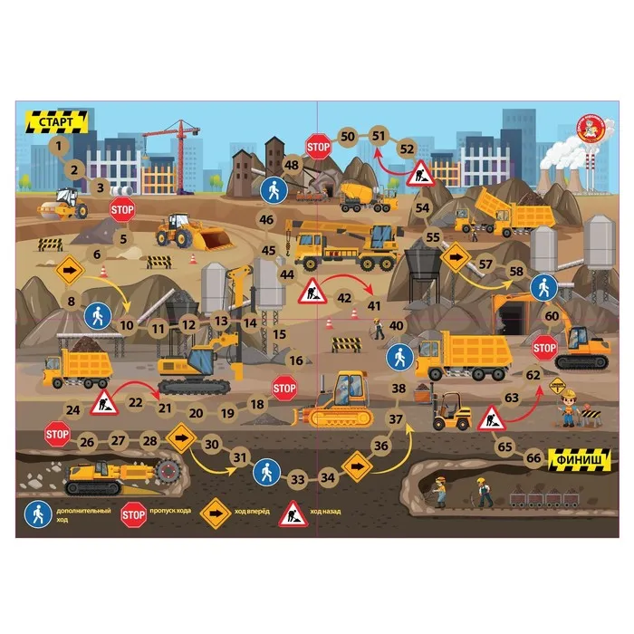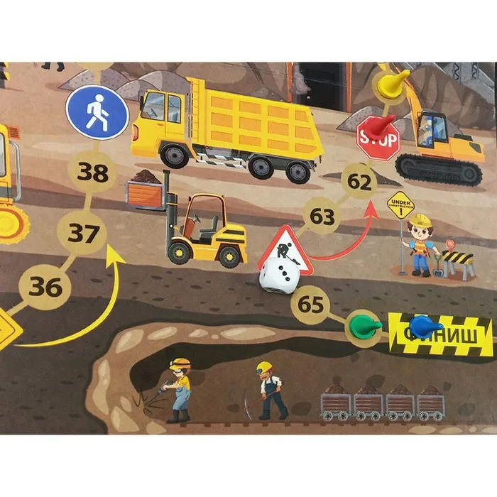 Настольная игра-ходилка «На стройке» — это игра-путешествие по огромной строительной площадке. Специальные знаки указывают на выполнение определенного действия. Возможно, игрокам придется идти назад и обходить опасные участки. Победит тот, кто придет к финишу первым.
