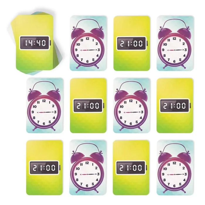 В комплект входит 20 карточек с механическими часами и 20 карточек с электронными.